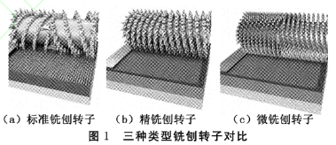 精(微)銑刨和傳統(tǒng)銑刨最主要的區(qū)別在于刀頭上刀間距的細(xì)密程度,刀間距決定了銑刨之后路面的紋理差別,精(微)銑刨處理之后的路面紋理要相對(duì)細(xì)密很多。這個(gè)差異主要是來自所用的銑刨轉(zhuǎn)子和控制參數(shù)的不同。如圖1所示,精銑刨和微銑刨所用的銑刨轉(zhuǎn)子上的刀齒個(gè)數(shù)比傳統(tǒng)的銑刨轉(zhuǎn)子多,排列和間距也比傳統(tǒng)的銑刨轉(zhuǎn)子密集。