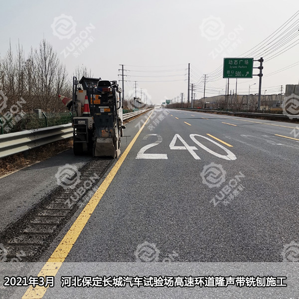 凹槽狀的隆聲帶是由半米小型銑刨機施工的,一般的規(guī)格是150*400mm,凹槽最深為13mm,截面為圓弧狀。凹槽狀的隆聲帶克服了凸塊隆聲帶的弊端,而且因為深度較淺,積水和積塵很容易被車輪的氣流帶走,而且連續(xù)高密度的凹槽寬度達到40公分以上,在制造輪胎噪音的同時也保證了車胎的抓地摩擦力,確保了行車安全。